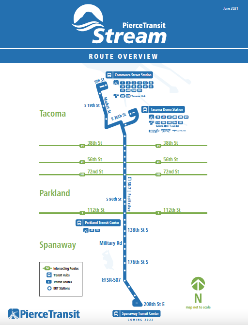 Pierce Transit’s first bus rapid transit (BRT) line remains in the design phase, the first line of a system in Pierce County called Stream. The agency is aware that one line is not much of a system and has directed consultants to conduct a planning study of the next four fixed routes to be upgraded to BRT. This Stream System Expansion Study (SSES) should be of great interest to Tacoma area residents.