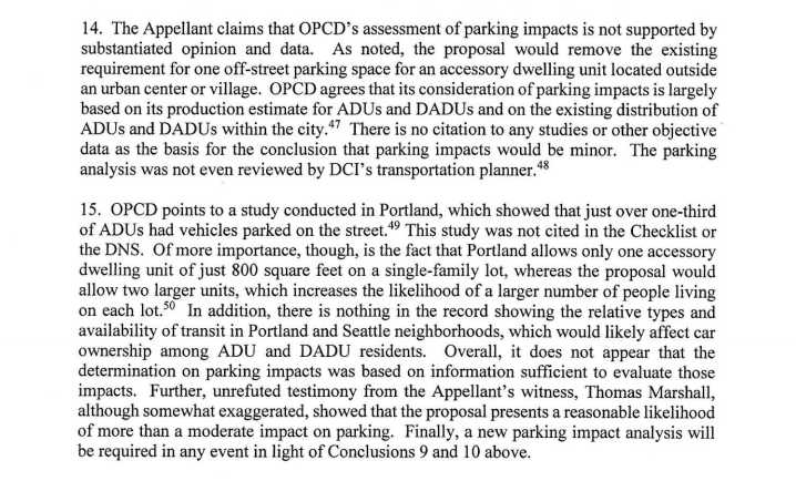 The hearing examiner also highlighted parking concerns. Bizarrely, the logic of our parking industrial complex is baked into our environmental laws. Thus, preserving parking is misconstrued as an environmental asset, much to the chagrin of climate change activists who’d like to see fewer cars and fewer tailpipe and embodied car emissions rather than more. In fact, environmentalists argue transit-rich cities like Seattle should lead in a societal transition away from car dependence. The environmental impact of a few more people parking on the street (apparently one third of ADU households if Portland is any guide) seems much less than paving more off-street parking spaces because of code requirements enabling bad environmental decisions. More parking spaces mean more impermeable surfaces, more runoff, and more induced demand for driving. There’s your environmental impact.