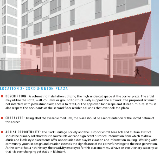 Since then Lake Union Partners has committed about $230k to pay for commissions and materials for the eight public art areas identified throughout the site, including what is now referred to as the 23rd and Union corner plaza site. Proposals should intend to collaborate with local African American cultural and historic organizations, such as the Black Heritage Society, but also seek to “extend the significance of the corner’s heritage to the next generation.”