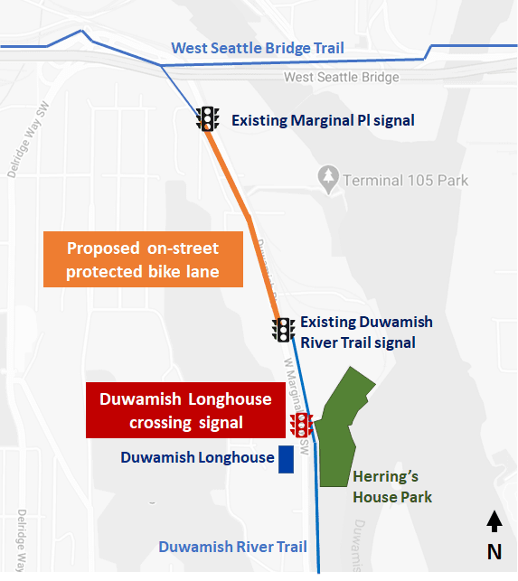 The bike lane will utilize a stretch of Marginal Way between the five-way intersection at Chelan Ave SW at the foot of the West Seattle Bridge, where only one travel lane heads southbound, and the Duwamish Longhouse, where in 2019 SDOT reduced the number of southbound lanes from two to one in order to improve sightlines for people crossing near the Longhouse without a signal.