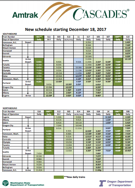 Amtrak Cascades will begin new service today between Seattle and Portland. Two additional roundtrips will operate filling out the daily schedules. Many passengers will also notice several other major changes, such as reduced travel times, a new Tacoma station, and different scenery.