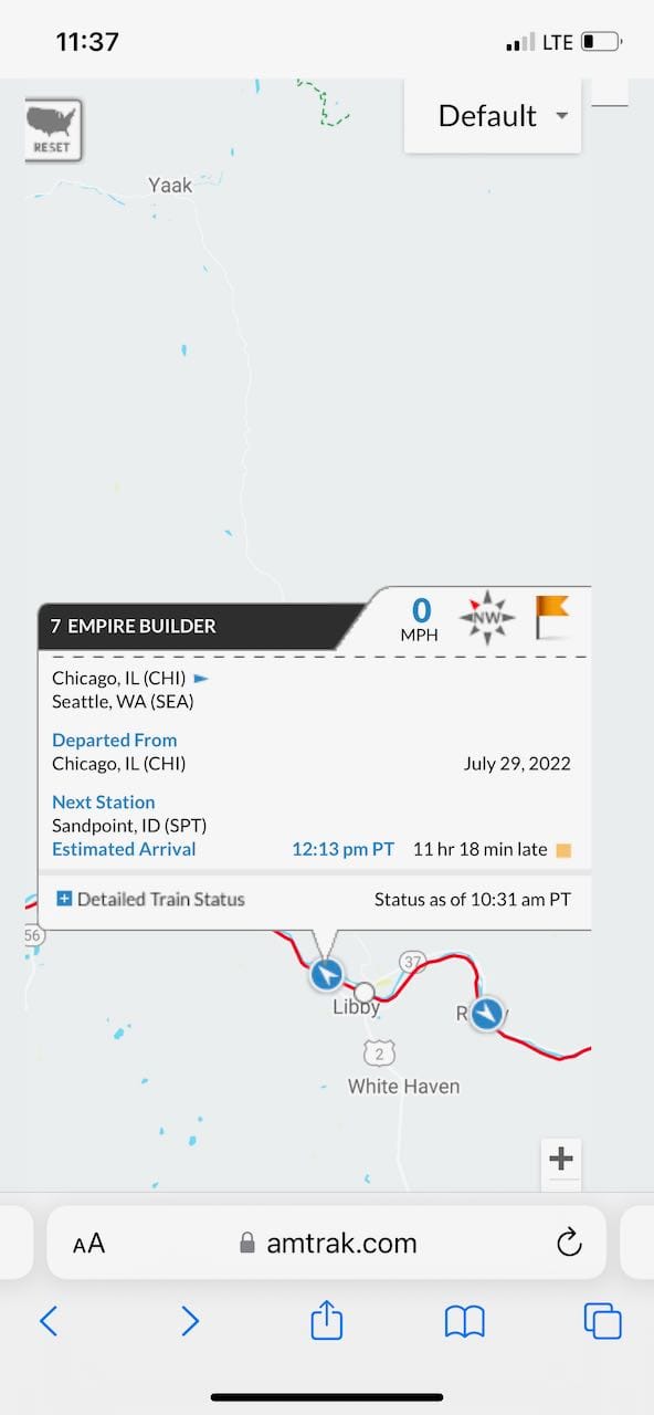 Then we hit Libby, Montana where we we got stuck behind a broken down freight train. For almost three hours, they worked to clear the traffic and our train sat stationary. When we started to move again, there was another delay as engineers and conductors were swapped out. Railroad staff have very strict rules about working hours, and our staffers needed to be relieved after their very long shift. In the end, where we were supposed to be out of Libby at midnight Sunday morning, we left Sunday at noon.
