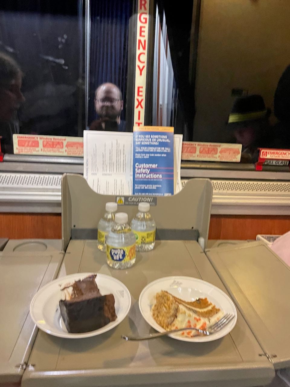 Here is where I get to praise the staff on these trains. From the conductors to the dining staff to the attendants, everyone was patient and gave the answers they could. After Libby, I brought up our soon-to-be-missed connection with the conductor. He rearranged us and our baggage out of the Portland bound train and into the Seattle ones. The dining car provided free lunch for everyone on the train regardless of seating. It was beef stew and rolls, but still better than Fyre Festival rations. After the trains split in Spokane, the dining car picked up pizza, pasta bowls, and salads in Wenatchee. There was also cake for everyone.