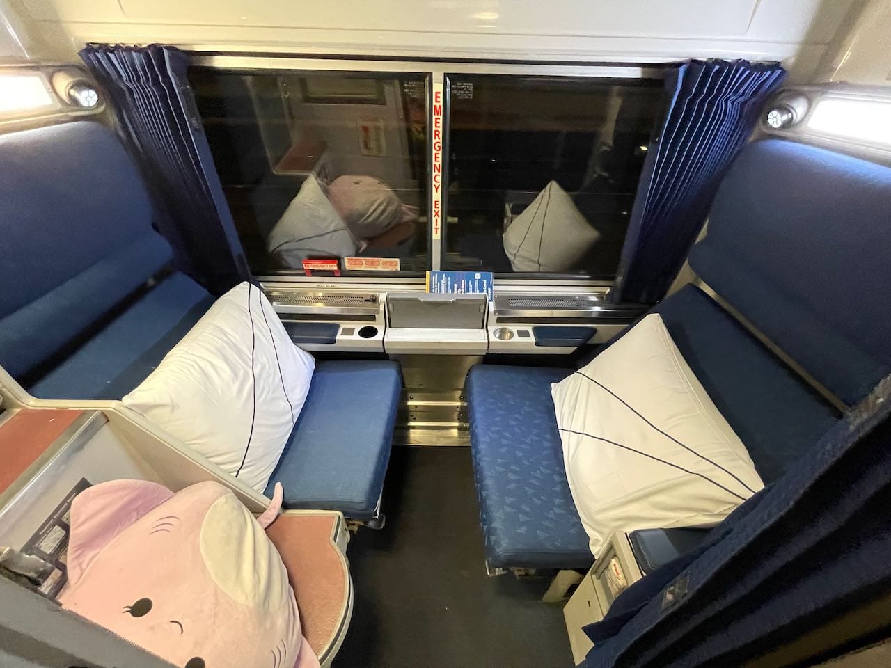 In the roomettes, sleeping is a compact affair. The two seats that face each other during the day slide together to create a lower bunk. From the ceiling, a second bunk folds down. Elbow rests double as steps to the top bunk and a net made from seat belt material hooks to the ceiling to prevent roll outs. As a single rider, I elected the top bunk and doubled up the mattress instead of putting in on the lower bed.