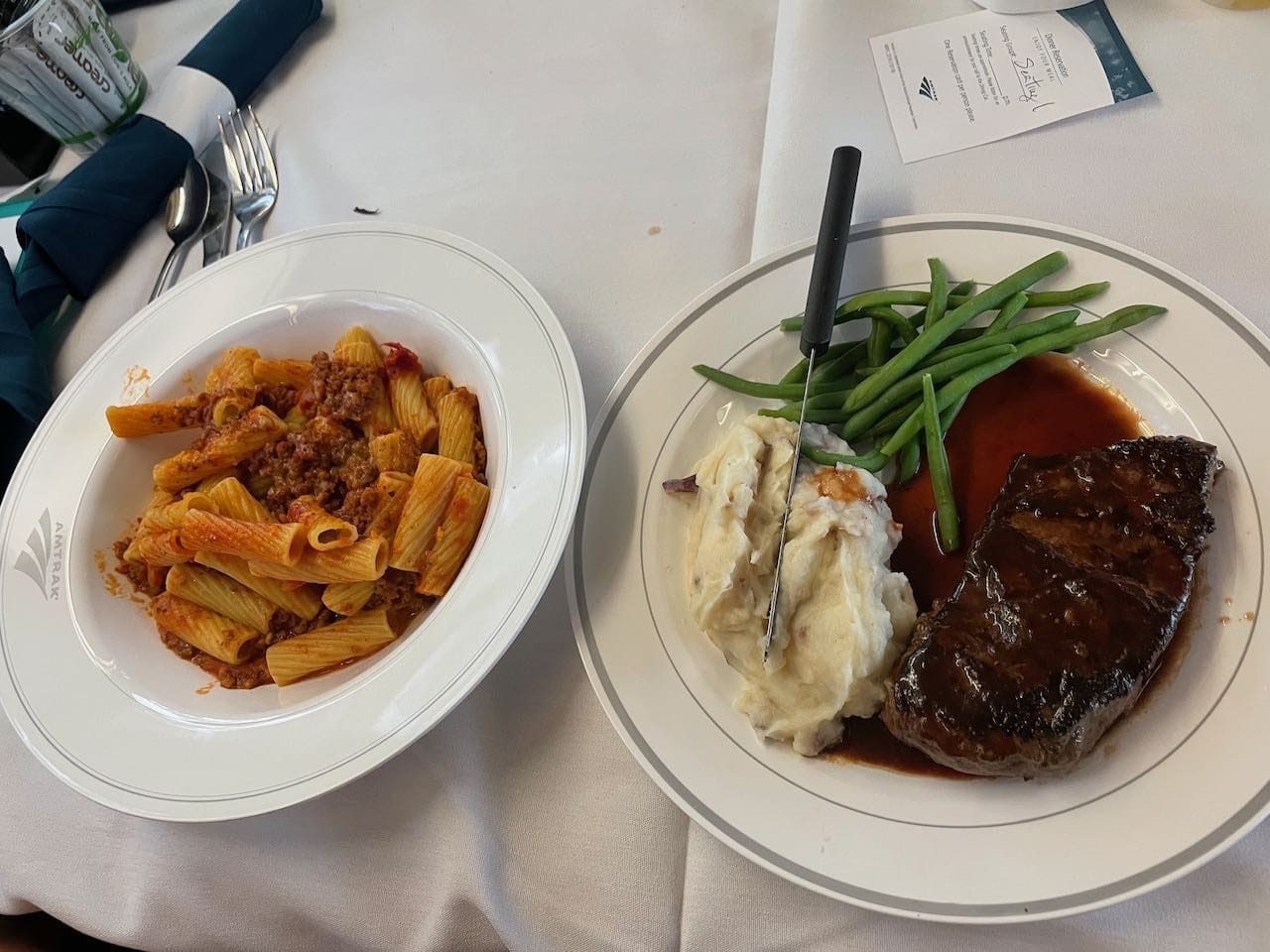 Dining on the Lake Shore Limited is a little different too, with no full dining car on these trains. They still serve hot food, but it is closer to pre-portioned airplane meals. Vegetarian options were hit and miss, so we ordered the pasta, and the meatballs got traded for more noodles between meat and non-meat eating family members.