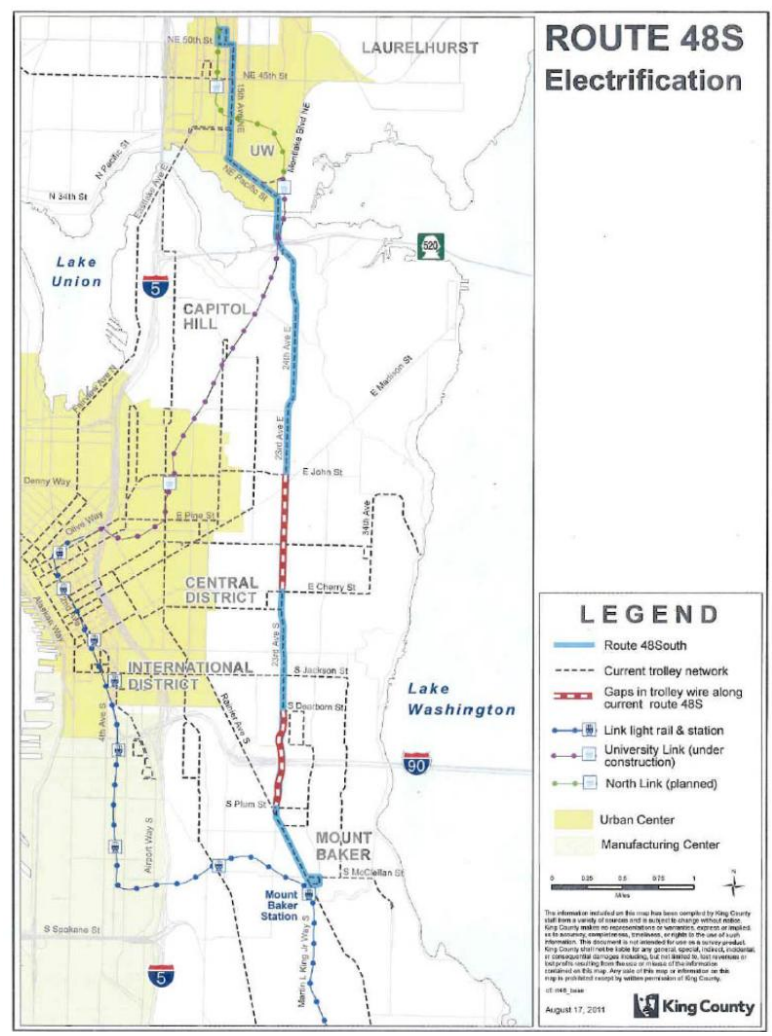 This fall, Metro will open the RapidRide G Line along Madison Street. Due to the fact that the buses serving the G Line need to have doors on both sides of the coach, Metro was not able to procure trolleybuses for the route from any manufacturer and the 13 vehicles serving the route will be diesel-hybrids, replacing the existing trolley service through First Hill. The Route 12, which currently serves Madison and is moving to E Pine Street, will return to trolley service within a few years when a final gap along that street is added. With eventual conversion of the 48, Seattle’s trolley network will be at best treading water even as the county works hard to switch the network over to electric buses.