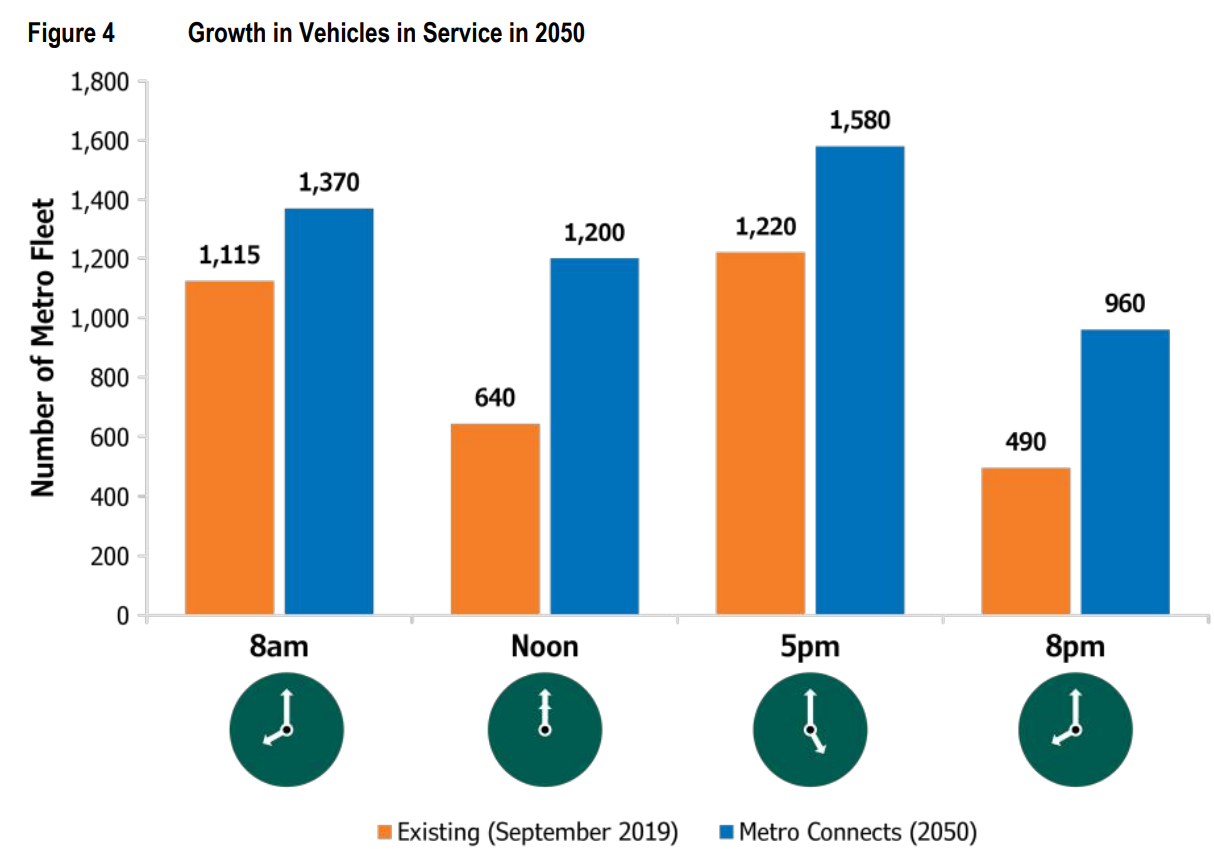 Metro’s 2027 plans for trolley network expansion include 20 new coaches, intended to support Route 48 but also potential increased service levels on other existing trolley routes. On paper, Metro’s service expansion plans would quickly outpace that, with the ambitious Metro Connects long-range plan calling for a significant increase in service and, by extension, the size of the fleet. If that vision is achieved, it would mean close to 30% more vehicles on the county’s roads at 5pm.
