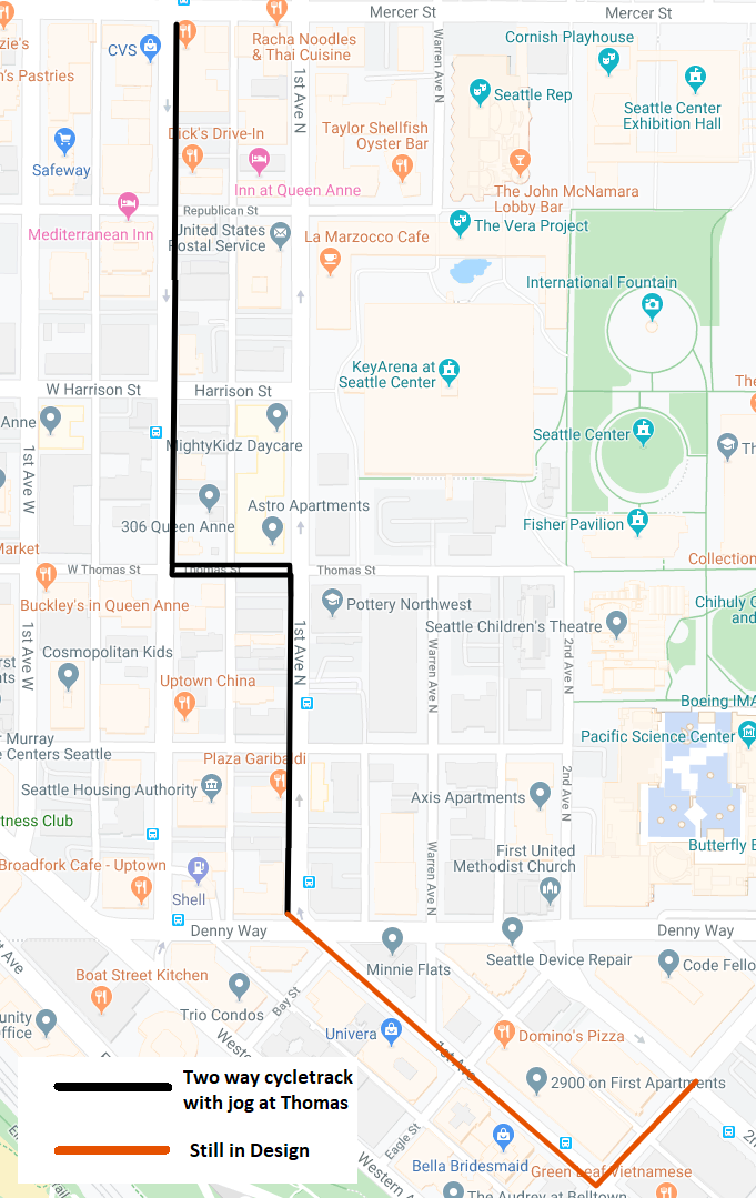 However, once construction is complete and the arena opens, people wishing to bike from one end of the neighborhood to the other will have to make a jog at Thomas Street, with a two-way cycletrack planned north of Thomas on Queen Anne Ave N and south of Thomas on 1st Avenue N. The connection on Thomas will mostly include physical protection from the traffic lane, but a short segment will not.