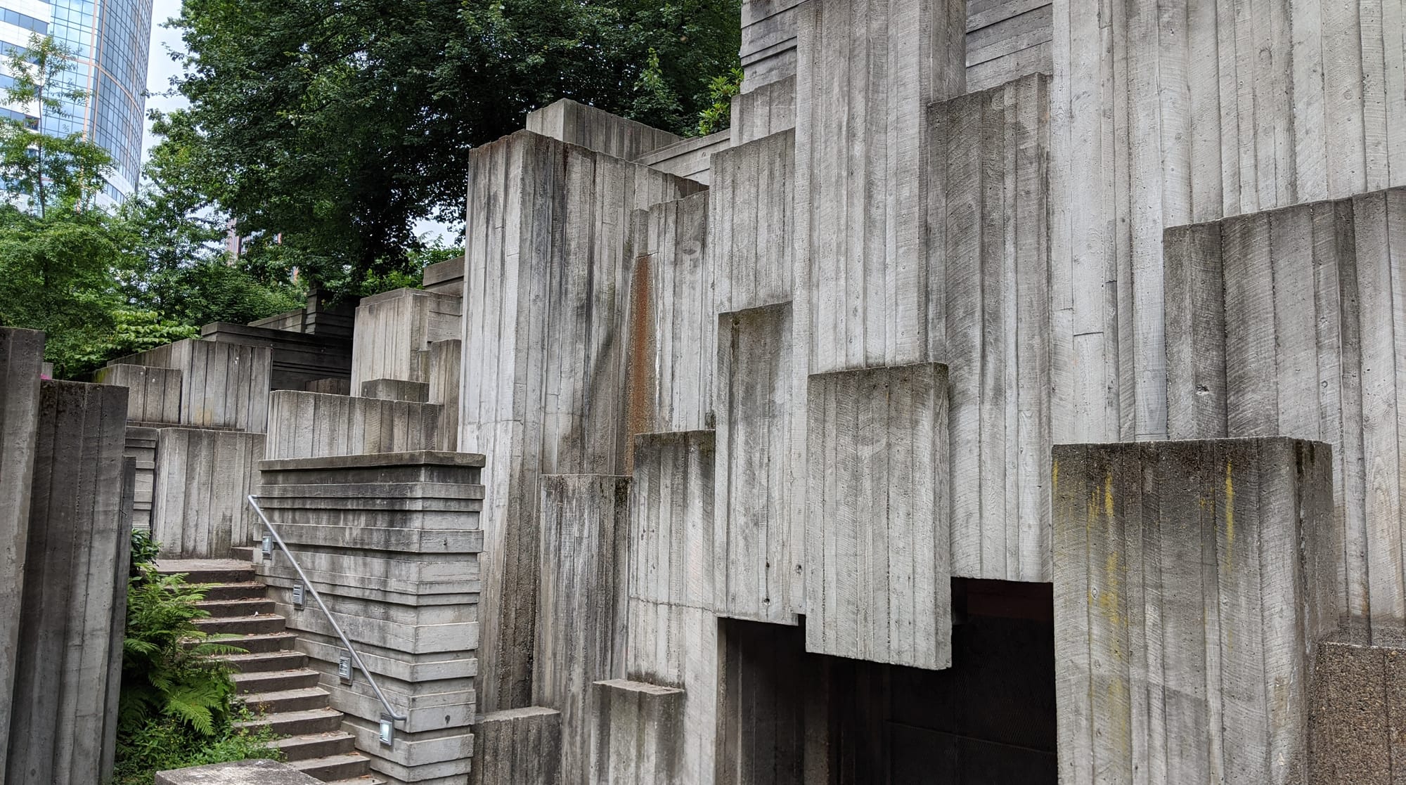 But Freeway Park has encountered problems as well over the decades. The park’s unique design has led to it often going unnoticed by people moving through the surrounding neighborhoods. While its Brutalist concrete maze elements have led to it being named as one of the world’s top seven parkour locations, those same features can make it feel unsafe to visit at times for people unfamiliar with the park.
