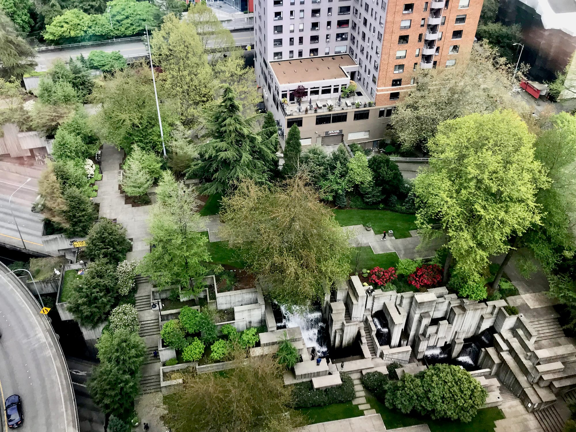 Designed by the famous landscape architecture firm Lawrence Halprin and Associates, Freeway Park has been widely recognized as a unique public space, earning attention from local in and national audiences. It was featured in a PBS documentary as one of the ten parks that changed America in 2016, and since then it has gone on to be added to the National Historic register (2020) and to receive landmark status from the City of Seattle (2022).