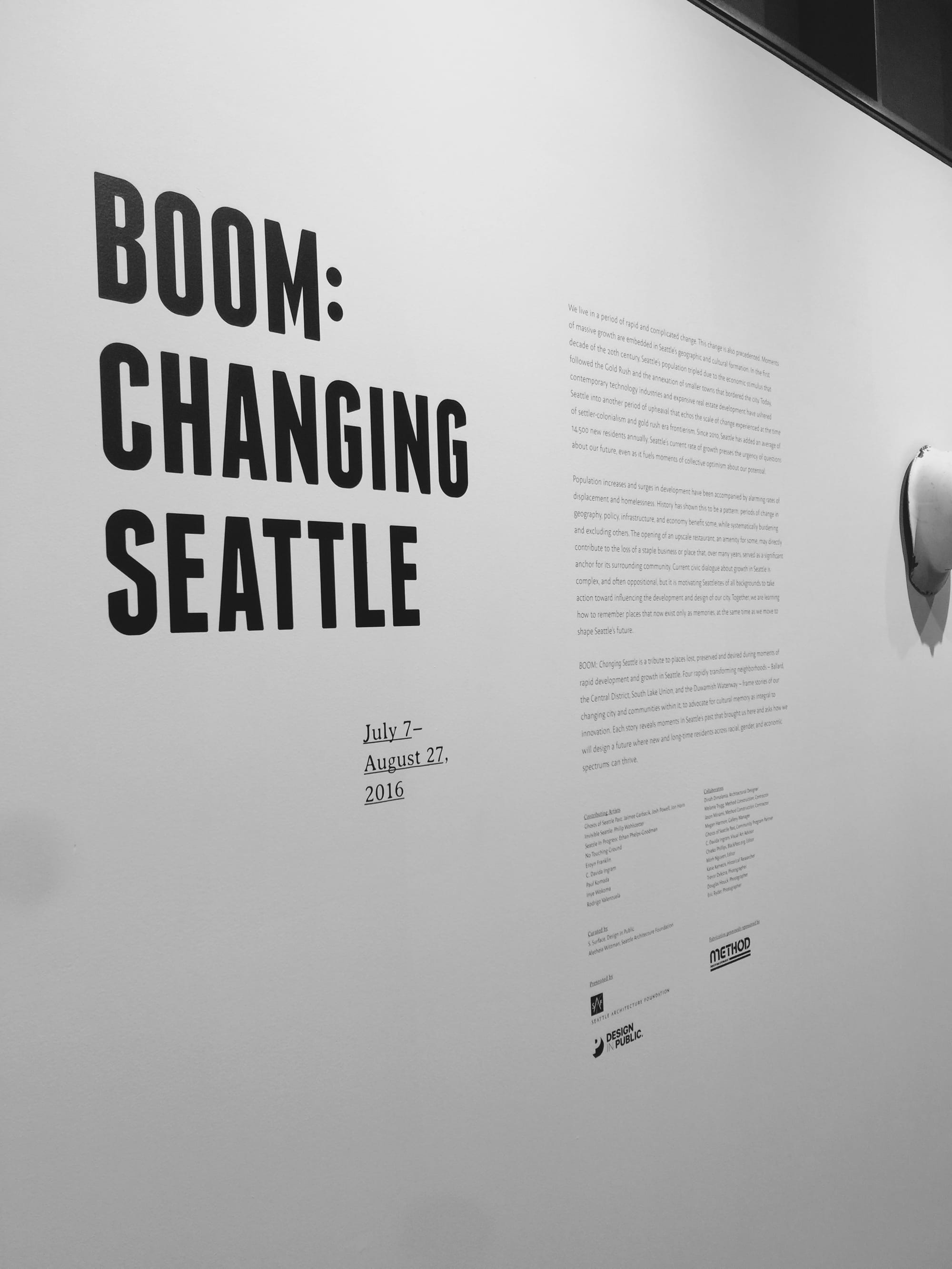 Aletheia Wittman wants Seattleites to have a sense of the language of design. She wants Seattle Architecture Foundation (SAF) to lead better civic engagement with ongoing discussions about growth and development throughout our city. Aletheia is the Exhibit and Public Programs Manager at SAF & co-curated the exhibit. S. Surface, Design In Public, understands exhibits like BOOM will enable citizens to become more engaged in the design process.