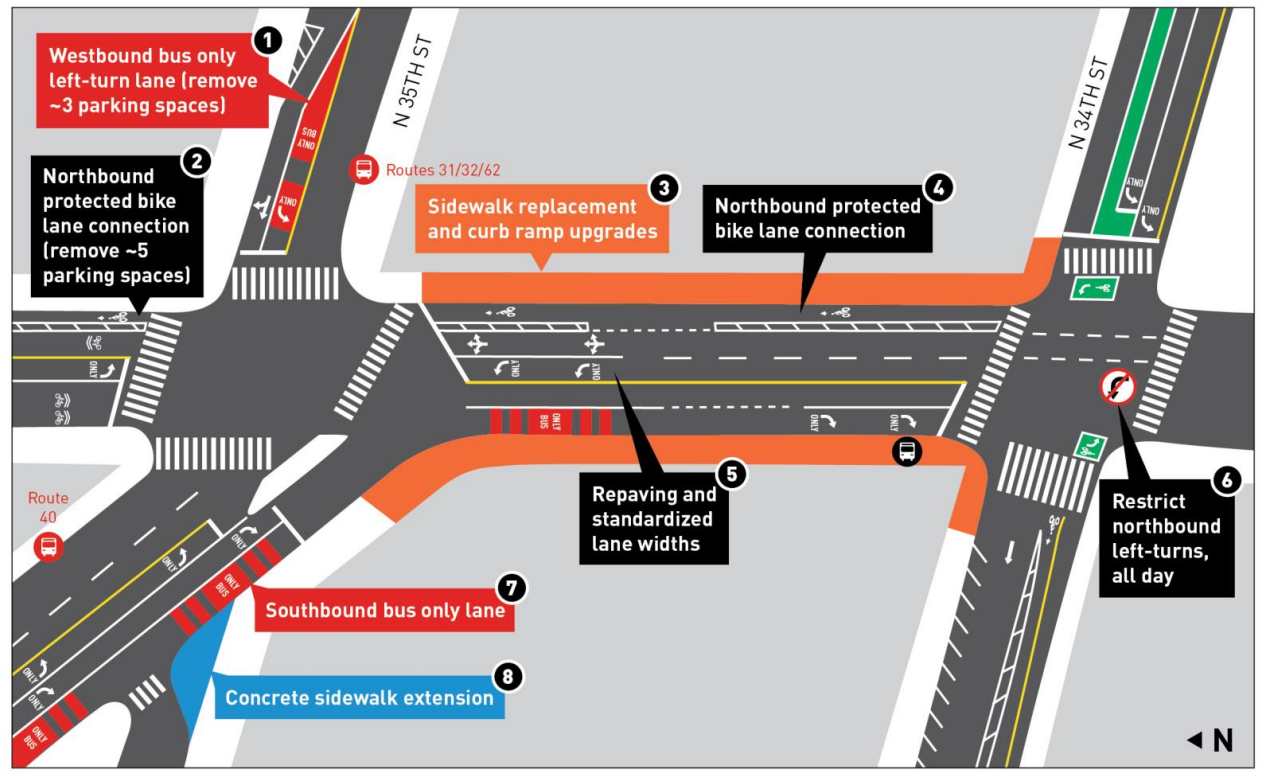 The only way the Route 40 project would “reduce bridge access” is through the conversion of one southbound lane on Fremont Avenue N between N 35th Street and N 34th Street to a bus-and-right-turn-only lane; one lane on the northbound side would turn what is mostly a bus stop into a one-way protected bike lane, with that stop relocated to N 35th Street. No changes are proposed for the immediate blocks on either side of the Fremont bridge.