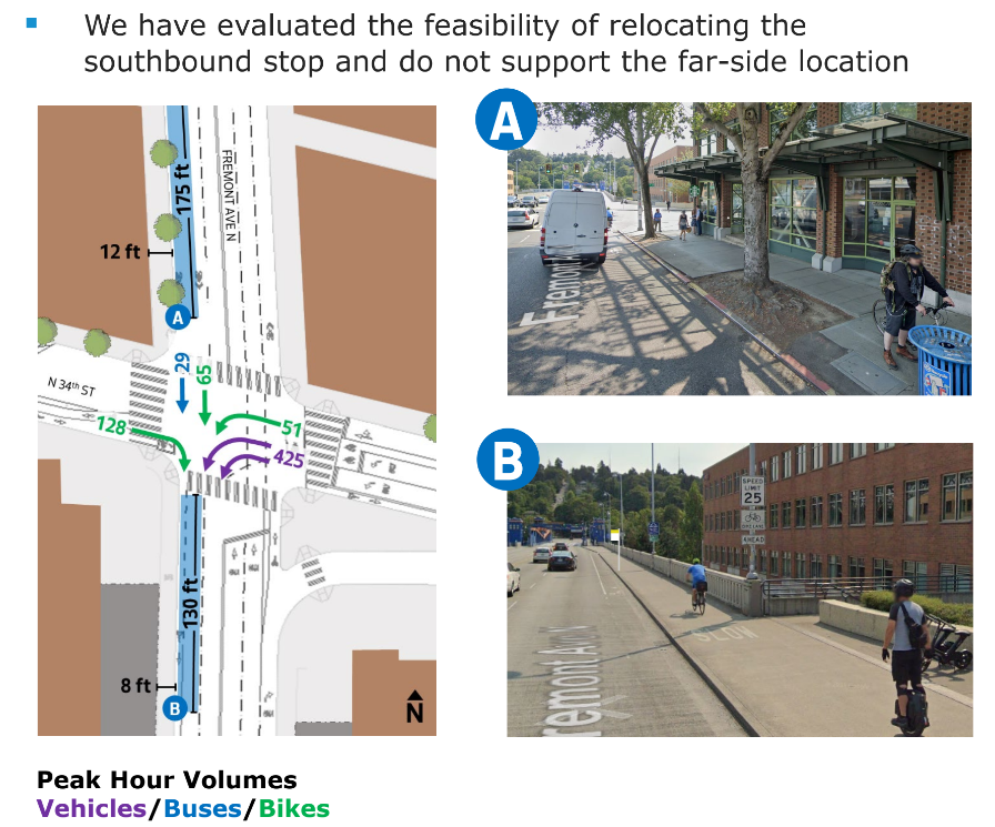 SDOT also looked at some modifications to the project that have not moved forward. A request from some Fremont businesses to relocate the southbound bus stop at Fremont Avenue N and N 34th Street, one of the busiest bus stops in Fremont, one block south to the immediate approach to the Fremont Bridge (where it had been located prior to 2007), was found to be infeasible. Riders would mostly be unable to board buses when the drawbridge is raised, and pedestrian and bike conflicts would increase, the evaluation found.