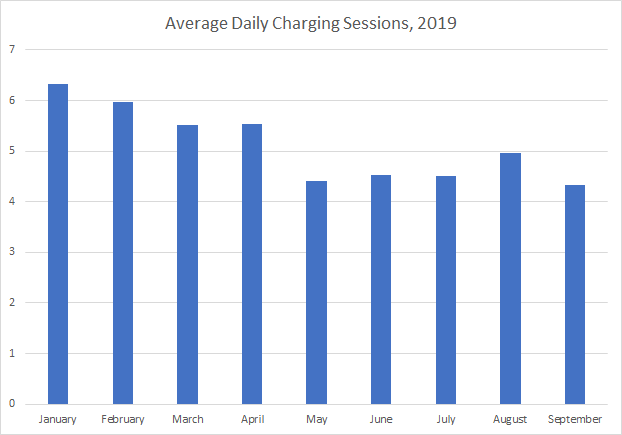 Six individual users accounted for a full one-third of all sessions where electric vehicle (EV) users charged their cars at Seattle’s only public EV charging station through early October, according to information obtained from Seattle City Light. Of the 2,982 sessions logged between January 2018 and October 2019, 1,029 sessions were logged by the same six people, with 404 of those accrued by the top user. Only around 400 unique people were logged as using the station since the beginning of last year.