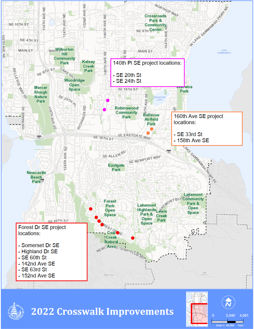 Because these items are noncontroversial by nature, it’s easy to overlook them, but there are occasional noteworthy things that pop out. One such item was the $1.76 million contract awarded to Kamins Construction for crosswalk projects in the Lake Hills, Eastgate, and Somerset neighborhoods. This funding will go towards improvements (such as flashing beacons, LED streetlights, and new curb ramps) at seven existing crosswalks and the creation of three entirely new crosswalks. All funding comes from the Neighborhood Safety, Connectivity, and Congestion Levy that Bellevue voters passed in 2016.