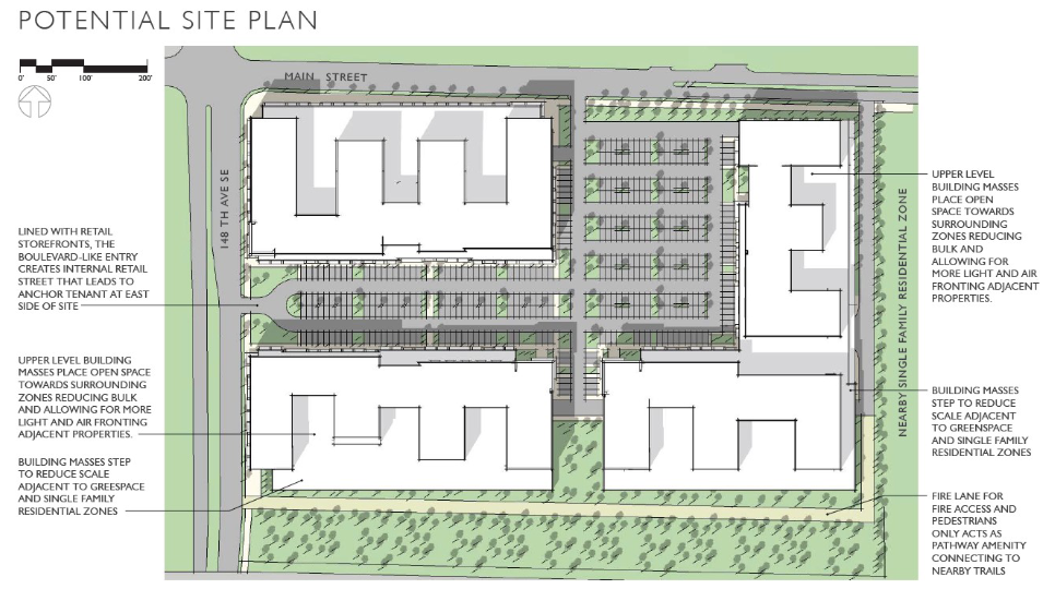 The Kelsey Creek Center, a neighborhood center located along the frequent King County Metro Route 245 and 148th Ave SE, is similarly devoid of housing. But opportunities to add residential development could be limited without an expansion of housing capacity on the site. “The Mixed-Use Lowrise densities and application of the Transition Area standards is unlikely to support sufficient capacity and flexibility to allow viable redevelopment,” wrote the developer in their EIS comments.