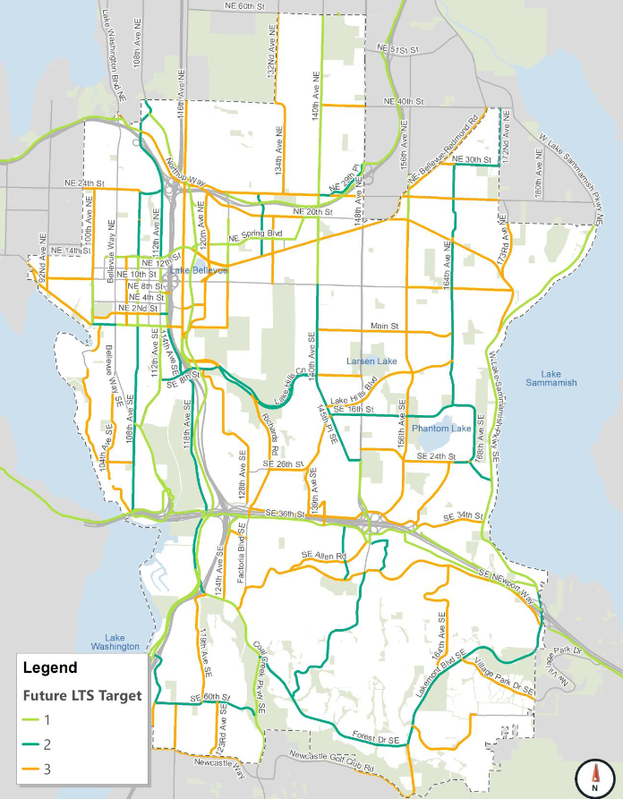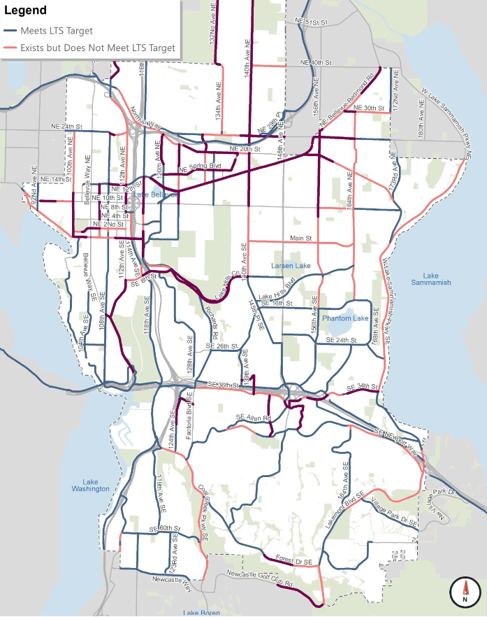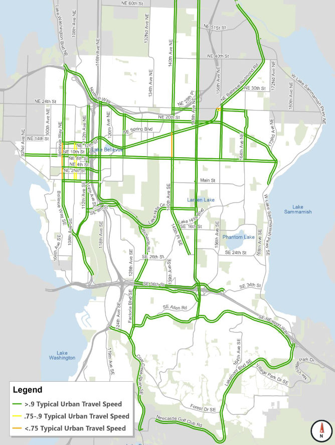 In the city’s designated growth areas, only 25% of Bellevue’s pedestrian network is meeting performance targets of at least 12 to 16 feet of combined landscape strip and sidewalk space.Only 53% of Bellevue’s cycle infrastructure currently meets the expected Level of Traffic Stress (LTS) metric.14 of 16 neighborhood transit connections (e.g., Downtown to Factoria and Crossroads to Eastgate) run at speeds of less than 15 mph.In contrast, 94% of Bellevue’s priority roadways are operating near the expected Urban Travel Speed.These statistics and standards paint a clear picture: because of historical policy choices, Bellevue’s road network is currently adequate to accommodate demand, but our pedestrian, cycling, and transit networks are in need of prioritized investment.As mentioned previously, however, these statistics (and thus which infrastructure will be prioritized) are significantly influenced by the targets that the Transportation Commission sets for each mode. If the body selects low or easy-to-meet targets for multimodal facilities while increasing targets for road infrastructure, it’s possible that Bellevue’s history of automobile-dominance will continue into the future.