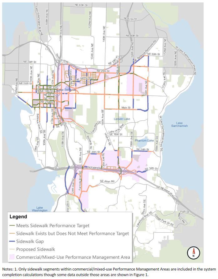 For example, transportation staff outlined the level of completion of each modal network based upon standards set in the city’s 2017 MMLOS Report. Although these standards are not necessarily the ones that the Transportation Commission will ultimately choose for the MIP, they paint a sobering picture of Bellevue’s multimodal infrastructure.