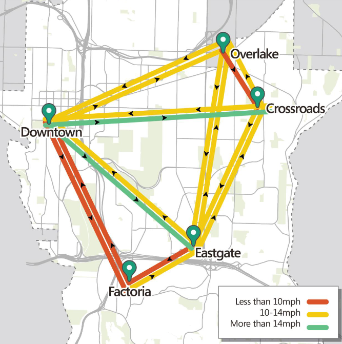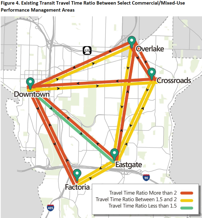 Recent commission discussions hint that this may the direction the body is going — in their July 8th meeting, commissioners directed staff to present transit performance data in a way not dependent on route speed, but rather based on a ratio of transit to automobile travel times. Staff’s report claims that conditions of transit travel times being less than 1.5 times greater than corresponding car travel times would encourage choice riders to choose transit. However, in a growing and urbanizing city, there are situations when transit travel can (and should) be faster than car travel. Tying transit standards to car travel times means that, if car travel times increase, the acceptable travel times for transit increase along with them, thus lowering the quality of the transit experience. This would be a disservice to existing transit riders and not serve to encourage drivers to make the switch. And even by this standard, Bellevue transit facilities are still shown to be significantly lacking.