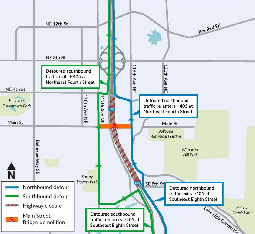Demolition of the bridge will force a short closure of I-405 itself later this month. Beginning at 10 p.m. Friday, June 17 and ending at 5 a.m. Monday, June 20, drivers traveling on the interstate in Downtown Bellevue will be required to detour onto 112th Avenue NE or 116th Avenue NE between NE 4th Street and SE 8th Street.