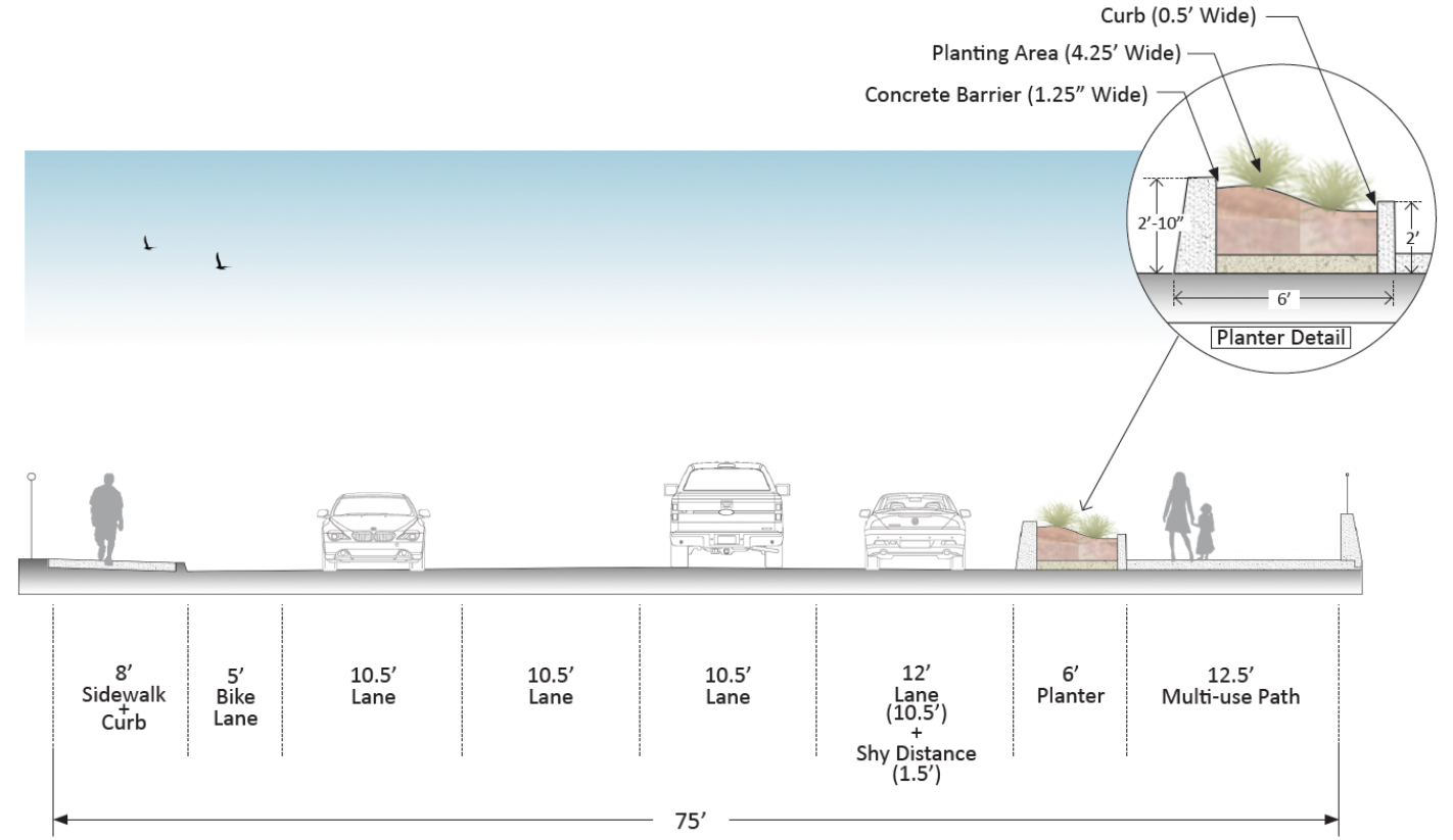 When the bridge fully opens to them though, people walking and biking will see improved facilities that better connect to the surrounding area. The current narrow sidewalks will be replaced with a 12.5-foot multipurpose path on the south side and an eight-foot sidewalk on the north side, with an additional five-foot bike lane on the north side for westbound cyclists. However, the road will still have at least four lanes for automobile traffic, and renderings suggest the bike lane will not be protected.