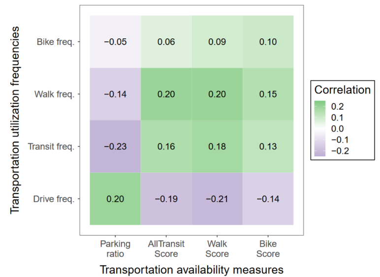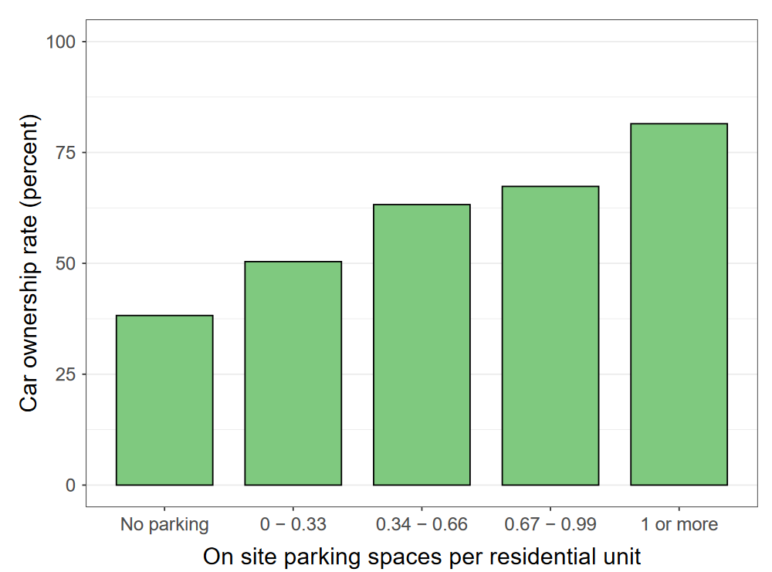 In a 2021 study, Adam Millard, Jeremy West, Nazanin Rezaei, and Garima Desai were able to establish a link between the availability of parking with vehicle ownership and transportation mode decision making. They found that higher rates of available parking per unit increased car ownership. A higher parking ratio was also positively correlated with driving frequency and negatively correlated with biking, transit use, and walking.