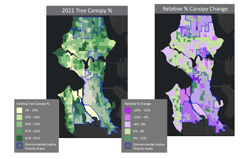 The latest accounting of Seattle’s canopy, dating back to 2021, shows Seattle has 28.1% canopy cover.