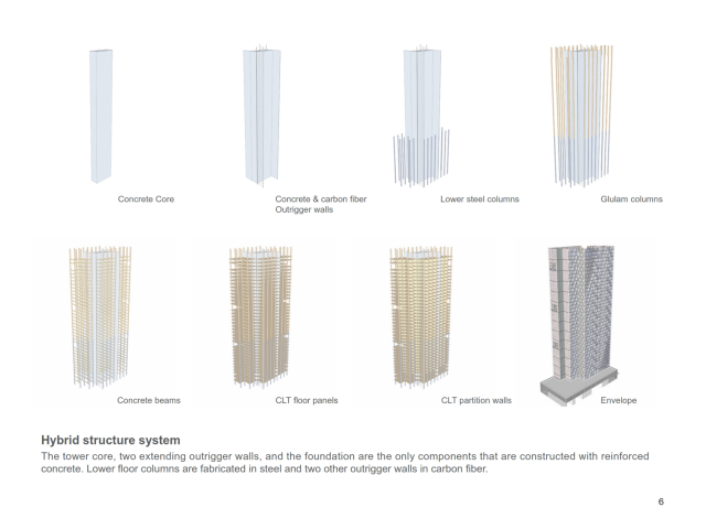 Seattle is the city with a history of wood—logging, ship building, the craftsman bungalows that dot the city. But wood could also be our future in the form of cross laminated timber (CLT) structural wood panels that allow wood to go much higher that the four or five stories it is used for now. Long used in Europe, CLT construction has the potential to change the building industry. In Vancouver, there is already an 18-story wood dorm building and in Portland they will hopefully soon break ground on 12-story wood building—the tallest in America. The Seattle Mass Timber Tower is a study of what it would take to construct one of the typical new 400-foot towers out of CLT. It is a boundary pushing analysis of hypothetical architecture.