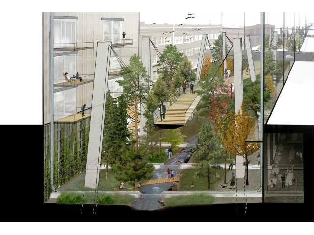 Lastly, sometimes hypothetical projects can be used to examine ideas that are bigger that what we can allow ourselves to imagine in the world of politics and budgets. The Right Way proposes that instead of filling the Battery Street Tunnel with the ruble of the viaduct as the state transportation department intents, we open it up to the sky and pair ecological restoration with a new vertically multilayered circulation street. Battery Street, along with University Street, are restored into forested creeks, like the ones the settlers of Seattle filled and culverted so many years ago. The new ravines of native plantings serve to cleanse urban runoff, provide auto-free pathways through the heart of the city, and allow for the sights and sounds of nature amongst the tall buildings.