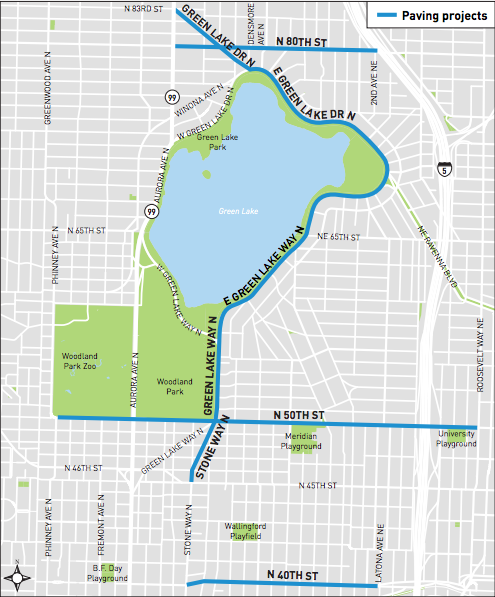 The Seattle Department of Transportation (SDOT) has been planning a set of repaving projects in the Green Lake area for around two years now. We first wrote about them in April of last year, when the department released initial plans that added bicycle facilities to a few key routes as a part of the repaving process–this saves money in a bike budget that is currently strapped for cash.