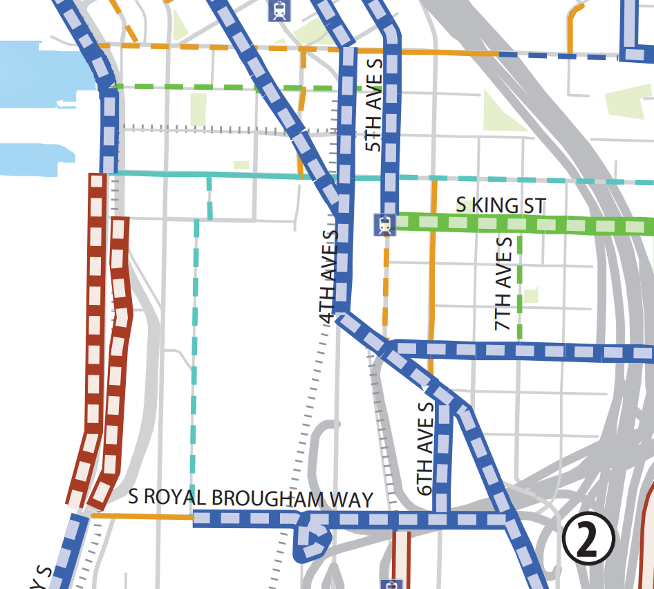 The Bicycle Master Plan, approved by the city council in 2014, in fact lays out a number of routes in South Downtown that the city has ostensibly committed to building: this proposed 6th/Main connection is not anywhere in it. 4th Ave S, 5th Ave S, S Washington Street, and S King Street are all listed as possible connectors to Dearborn.