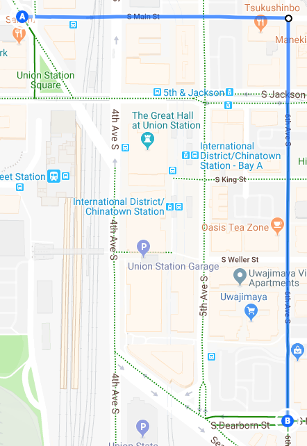 S Main Street also currently has old Waterfront Streetcar tracks that are unlikely to be refurbished for use anytime soon, and of course the route crosses S Jackson Street where there is an active streetcar line. At 6th Avenue S there is a streetcar track switch, with several sets of curved tracks.