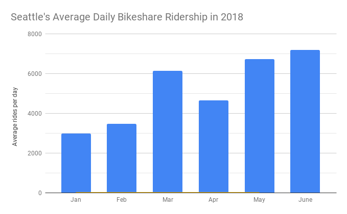 Displaying Seattle’s ridership figures next to Portland’s dock-based Biketown figures is a bit misleading. Portland has just 1,000 bikes in its system compared to the 10,000 bikes Seattle has permitted, and a limited service area compared to the entirety of Seattle’s city limits. SDOT has argued that rides-per-bike figures don’t matter for dockless bikeshare (since private companies are funding the bounty of bicycles) but do matter for dock-based systems. But if we look at the 2018 rides-per-bike figures, Biketown had the edge, particularly in the booming May when its 2,560 rides per day worked out to 2.56 rides per bike per day–buoyed by its ride free for bike month promotion. Seattle posted an impressive 6,737 bikeshare rides per day in May, but, spread out over our 10,000 bikes, the per-bike figure is 0.67. Last summer, that figure was 2.25 amid the hype of Seattle’s dockless rollout, free-ride promotions, and fewer bikes to go around. We already noticed a drop in per-bike figures at the “mid-pilot check-in” as more bikes hit the streets faster than ridership increased.