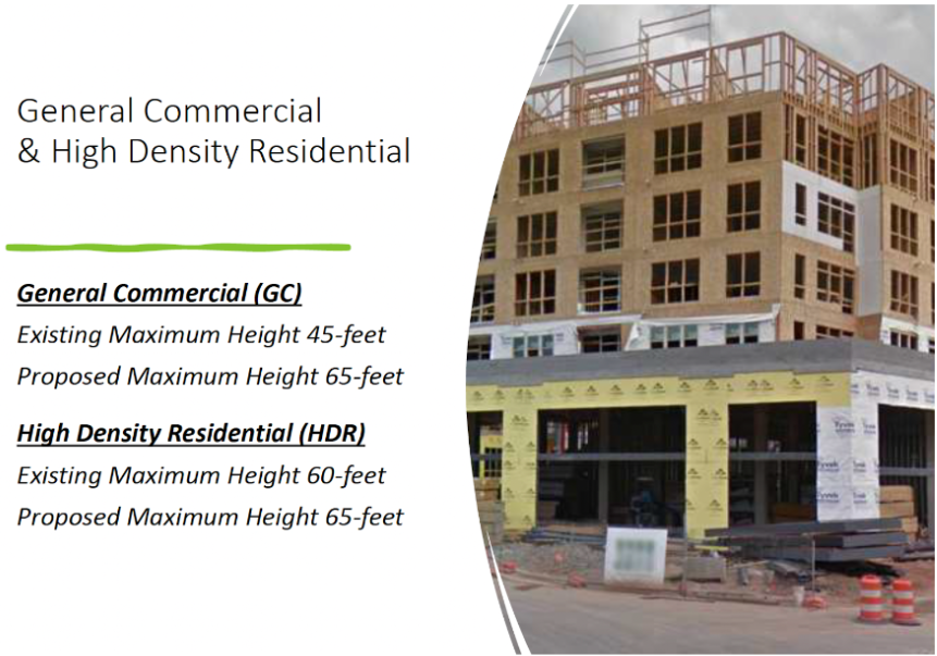 In District Centers outside of downtown, the City seeks to greatly increase the allowable density of both “High Density Residential” and “General Commercial” zones. These zones would allow for the first time the highly efficient “five-over-one” building type of multi-story wood frame over one story of concrete. Density limits would be eliminated.