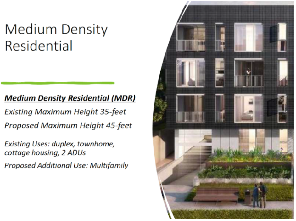 “Medium Density Residential” zoned areas would receive max height and other density-enabling zoning changes. All other residential neighborhoods would be upzoned to conform with the fourplex requirements in the state’s “Missing Middle Housing” law (HB 1110) passed in 2023. A 45-foot height limit is much more permissive than proposals put forward for Seattle’s lower-density residential zones and are set to allow developers more flexibility.
