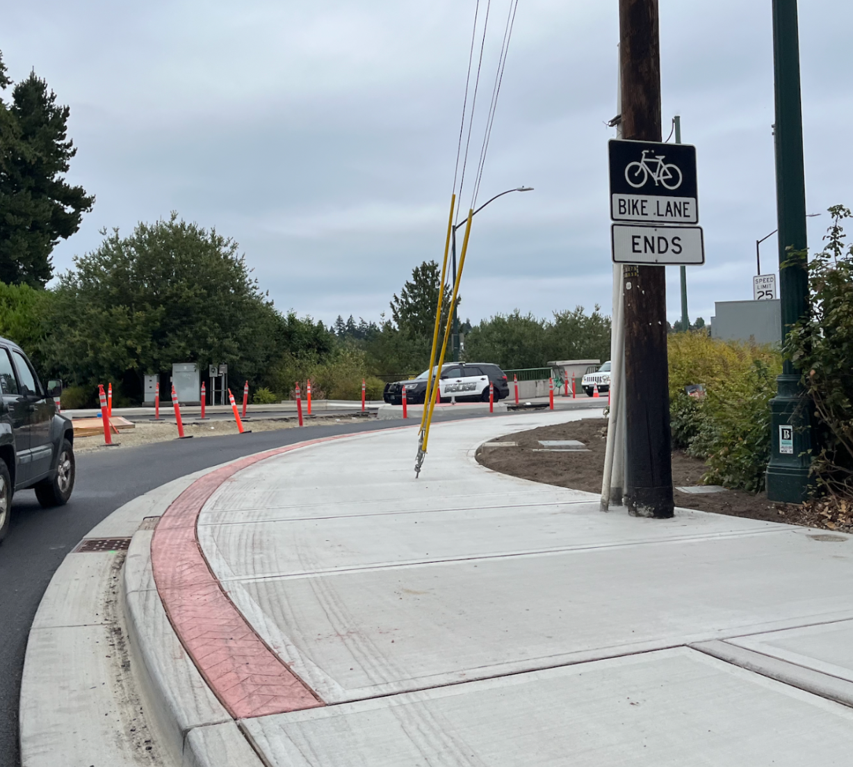 Below, I’ll discuss two recently-completed projects, which exemplify the inability of local streets departments to design and build safer streets. Bremerton’s tortured city borders mean the two projects – both in the heart of the City, were completed by different governments. The Washington/11th roundabout was built by the City of Bremerton. The West Hills School street safety project by Kitsap County were both touted as street safety projects, but achieved the opposite for people outside of cars.