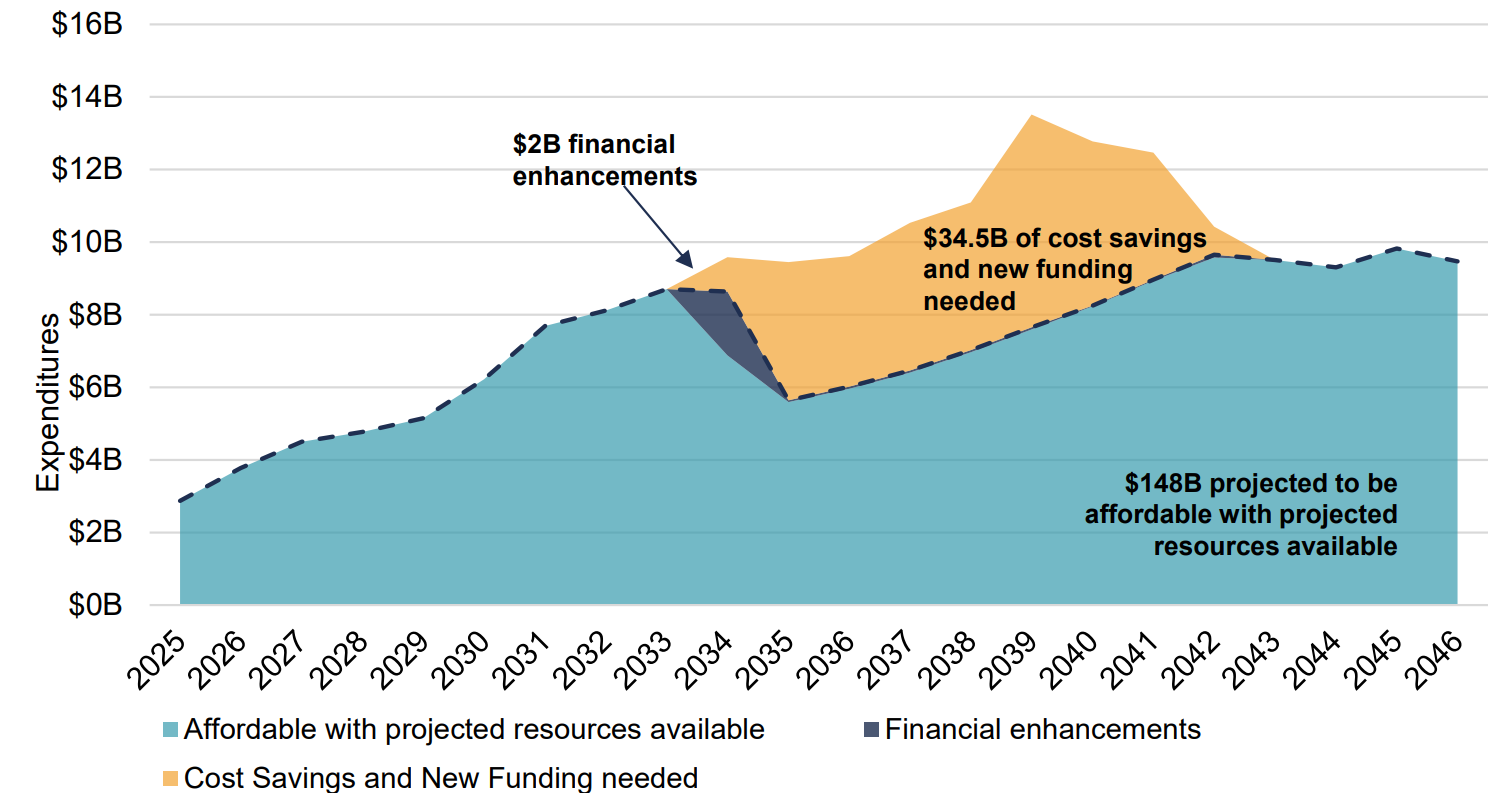 On top of lower-than-expected revenue forecasts and an expected need to increase operational expenses, that shortfall includes a $20 billion to $30 billion gap to complete the slate of new light rail lines approved with the Sound Transit 3 (ST3) package in 2016.