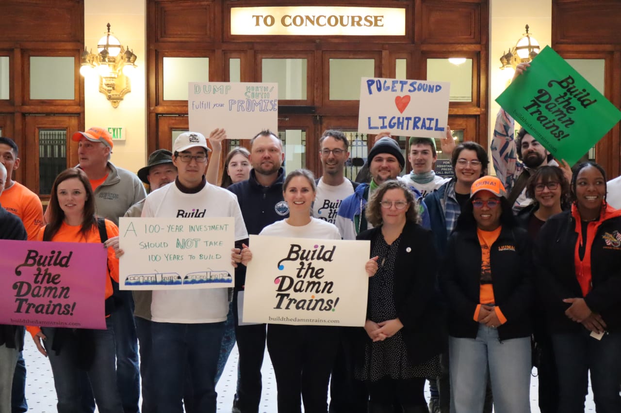 Leaders from transit advocacy organizations across Central Puget Sound gathered in front of Sound Transit headquarters Thursday with one clear message: “Build the damn trains!”