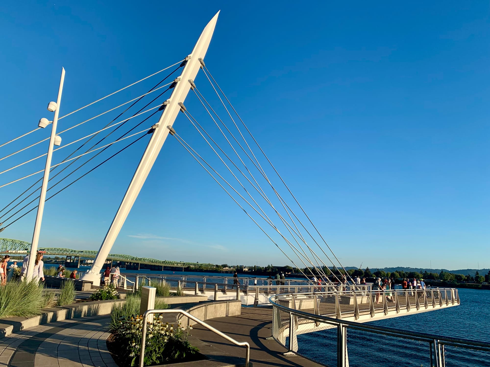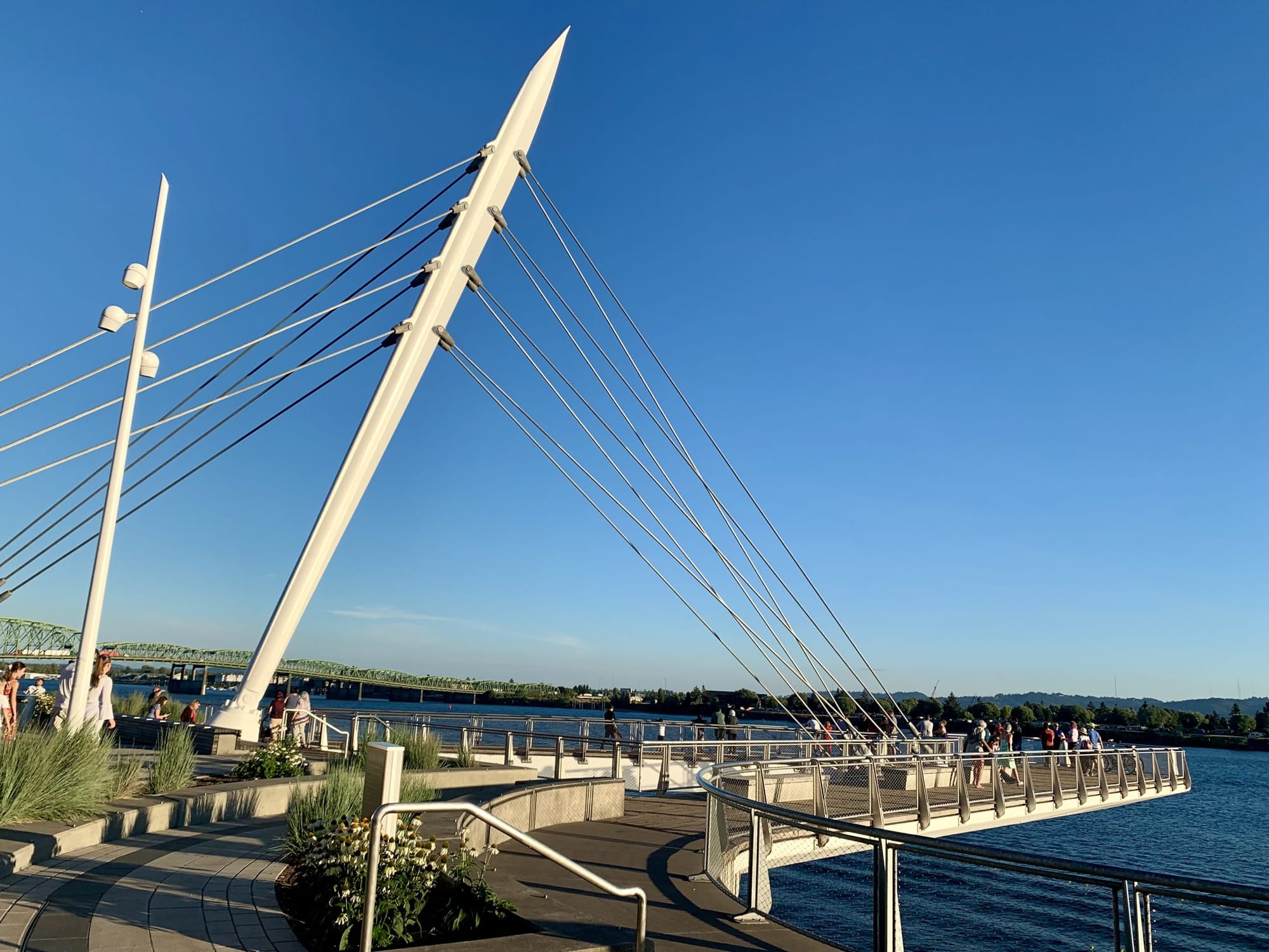 One of Kirkland’s first suggestions was to change the design of the pier so that it would be suspended over the river using cables, rather than held up by concrete pilings sunken into the water. The mast cable-stayed pier would create a healthier aquatic environment for fish, which Kirkland felt was important to achieving the project’s broader goals since the land had gone through environmental remediation as part of the development process.