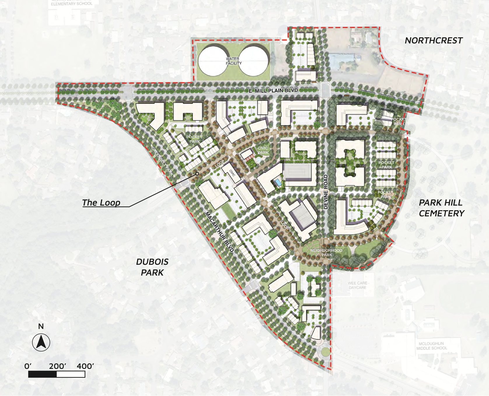 The Heights District will be constructed on and near the location of the former Tower Mall, which encompasses 63 acres that will eventually be the site of 1.58 million square feet in housing, commercial and office spaces, hotel and multipurpose developments, all anchored on a civic plaza, with a festival street and neighborhood park. The project also includes a three-quarter-mile “Grand Loop” that builds connections into the surrounding area. Referred to as “part street and part park,” by the City, the landscaped Grand Loop path will feature outdoor dining, games, seating, and wayfinding elements representing Vancouver’s local culture, history, and natural environment.