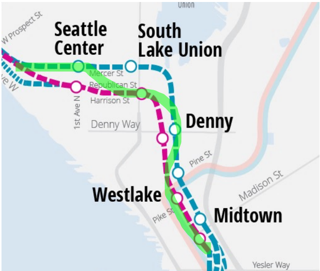 In a recent Sound Transit Board meeting, Mayor Harrell revealed his administration’s preference for Mercer Street location in Uptown to avoid impacts to KEXP, other arts organizations, and performance venues in the Seattle Center. The resolution also backs Terry Avenue in Denny to avoid traffic impacts to Westlake Avenue, deviating from the agency’s preferred alternative. A four- to six-year-long closure of Westlake Avenue, which cuts through Amazon’s campus and is a major transportation artery for major employers and residents throughout North Downtown, has proven to be too tough a pill to swallow.