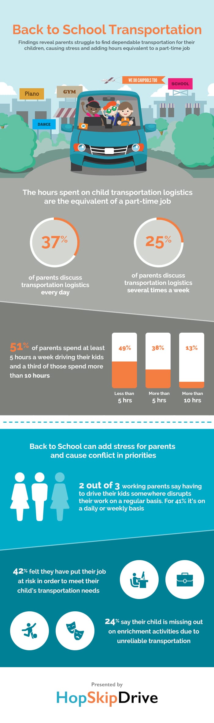 Roughly 50 percent of American parents drive their children to school. A recent Google consumer survey found 44% of parents spent five hours or more driving their kids to school and activities each week, while private ride service company HopSkipDrive reported that of 1,000 parents polled 51% spent five hours or more driving their kids, and more than 1 in 10 spent 10 hours or more, the equivalent of a part-time job.