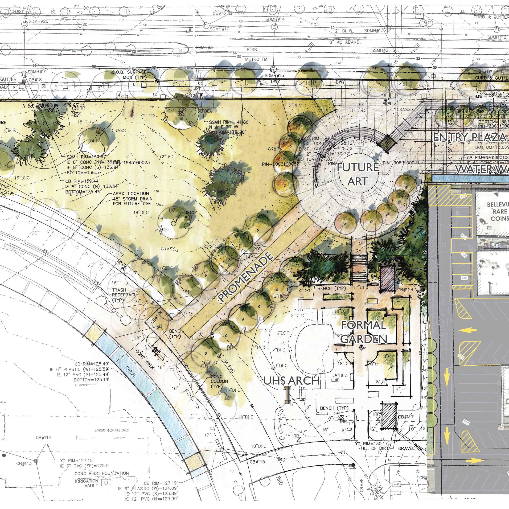 - “Complete the Circle” and Inspiration Playground at Downtown Park – Work completed in 2017 added a canal, promenade, and water features, parking consolidation, landscaping, and formal connection between the park and “Old Bellevue”;