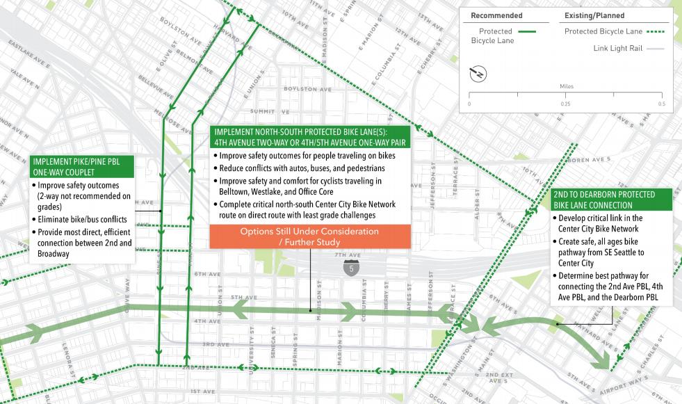 When the three transportation agencies involved in the One Center City plan–King County Metro, Sound Transit, and the Seattle Department of Transportation (SDOT)–presented their recommendations for near-term improvements in Downtown Seattle, one of the most hopeful items was a clear plan to connect Downtown with Capitol Hill with protected bike lanes–and fast.