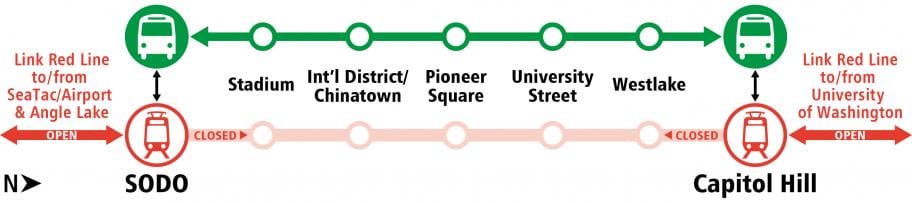 For three weekends this fall, Sound Transit will fully close light rail stations in Downtown Seattle to prepare for the Connect 2020 project, the transit agency announced last week. Replacement bus service will bridge the gap between Capitol Hill Station and SODO Station with stops on or near normal station locations. Trains will still operate between University of Washington Station and Capitol Hill Station as well as SODO Station and Angle Lake Station.