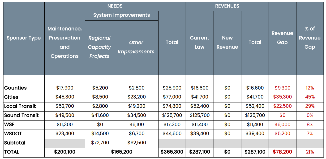 New analysis conducted by the Puget Sound Regional Council (PSRC) spells out a significant shortfall in available funding for transportation across all levels of government in central Puget Sound in the coming decades. By 2050, the gap between expected revenue and funding needs for transportation at state and local governments across King, Snohomish, Pierce, and Kitsap Counties is expected to exceed $78 billion — a 21% shortfall.