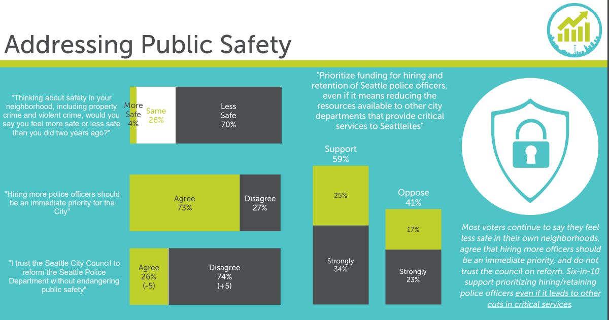 The poll found support for some centrist and conservative positions on other topics, such as police hiring. For example, 73% of respondents agreed with this prompt: “Hiring more police officers should be an immediate priority for the City.” Moreover, support remained relatively high at 59% when framed as police hiring and retention spending “even if means reducing resources available to other City department’s that provide critical services to Seattleites.”