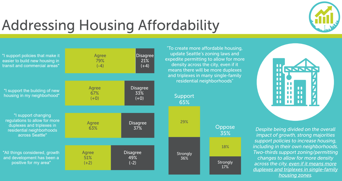 The Seattle Metropolitan Chamber of Commerce released its twice annual “Index” poll of Seattle voters today and found even stronger support for new housing than last time around, even when that came to replacing single family homes in respondents’ own neighborhoods. The poll (crosstabs) found 65% of respondents supported adding triplexes in “many single family neighborhoods,” which was up from 61% in a similar question in the chamber’s March poll.