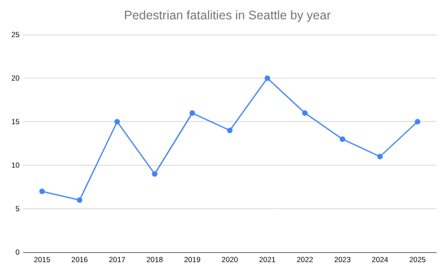 With decreases three years in a row, the trend line appeared to be continuing to fall throughout Harrell’s term. But so far in 2025, 15 pedestrians have been killed in traffic crashes, with over two months left in the year. Overall pedestrian deaths remain much higher than they were a decade ago, when Seattle committed to eliminating all fatalities on city streets by 2030.