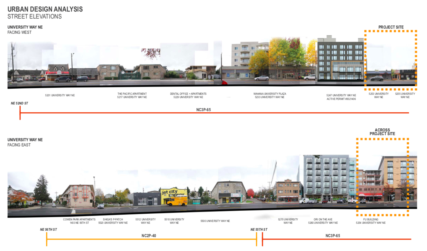 A proposed infill development on The Ave at NE 52nd Street illustrates what might be lost through an MHA exemption for the area. Current building plans are for a six-story structure (65 feet) that would contribute 89 units of housing with retail space on the ground floor. Under the City’s proposed MHA zoning, the building would only rise one to two stories higher, and it would be subject MHA requirements to contribute to affordable housing.